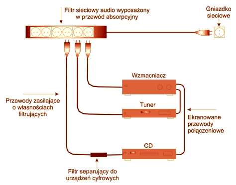 systemu audio Jeżeli do dyspozycji posiadamy tylko jeden filtr sieciowy, sposób przyłączenia urządzeń zestawu audio powinien być ustalony doświadczalnie, na podstawie prób odsłuchowych. Jeżeli podłączenie urządzenia cyfrowego powoduje pogorszenie dźwięku zestawu, należy zastosować dodatkowy filtr separujący lub włączyć urządzenie bezpośrednio do sieci. Istotnym zagadnieniem jest właściwa polaryzacja wtyczek sieciowych poszczególnych urządzeń. Niestety, obowiązujące w Polsce normy (uziemienie w postaci bolca) skutecznie utrudniają przeprowadzenie jakichkolwiek prób w tym zakresie. Często na przeszkodzie staje również prozaiczna przyczyna - większość tańszych urządzeń posiada kable sieciowe zamontowane na stałe. Trzeba więc zadecydować, czy wystarczy podłączyć je standardowymi kablami do filtra sieciowego, czy dokonać niezbędnych przeróbek, które pozwolą na użycie specjalistycznych kabli sieciowych. Osiągnięcie optymalnych efektów wymaga, podobnie jak ma to miejsce przy doborze np. kabli głośnikowych, przeprowadzenia wielu doświadczeń i prób odsłuchowych. Jednak zagadnieniom tym warto poświęcić sporo uwagi, gdyż właściwe rozwiązanie problemu zakłóceń elektromagnetycznych w systemie elektroakustycznym jest dla jego funkcjonowania równie ważne, jak odpowiedni dobór kabli połączeniowych, czy optymalizacja właściwości akustycznych pomieszczenia odsłuchowego. |