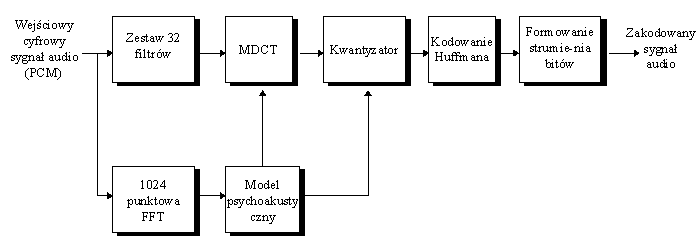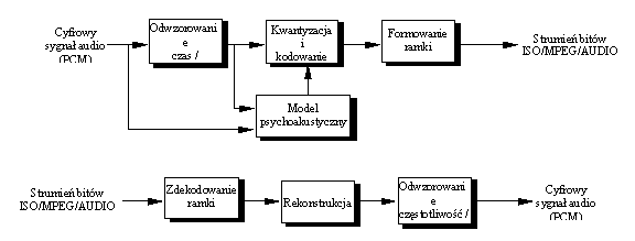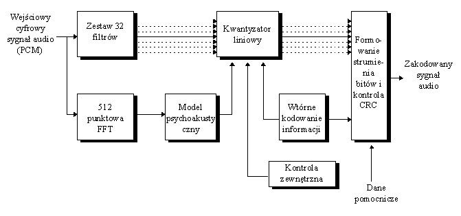 owane wartości próbek przesyła się razem ze współczynnikami skalowania do układu formatującego strukturę ramki fonicznej.Dekodowanie sygnału przebiega w odwrotnej kolejności, tyle, że pominięty jest tutaj model psychoakustyczny. Jest to najbardziej złożony blok, dlatego kodowanie przeprowadza się w taki sposób, aby detekcja nie wymagała jego użycia. Jest to również korzystne ze względów ekonomicznych, gdyż zmniejszenie dzięki kompresji przepływności kanału odbywa się kosztem wykonania pojedynczego egzem