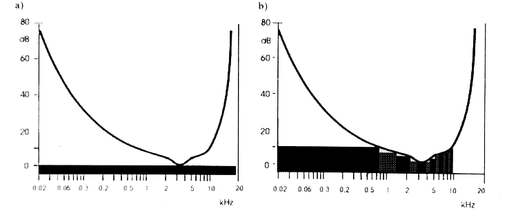 Aby szum kwantyzacji nie był słyszalny musi się on znajdować poniżej krzywej progu słyszalności ucha ludzkiego. Ponieważ charakterystyka tego progu zależy od częstotliwości (rys. 3a), w przypadku kwantowania sygnałów szerokopasmowych konieczna jest odpowiednio duża liczba poziomów kwantowania, by szum k