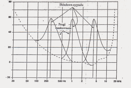 obiera dokładność kwantowania w tym paśmie, żeby szum kwantyzacji znajdował się poniżej progu maskowania.W przypadku złożonych sygnałów fonicznych, występuje zjawisko maskowania (zagłuszania) niektórych tonów przez tony o większej amplitudzie. Jest to równoznaczne z podwyższeniem w pewnym obszarze progu słyszalności (rys. 4).