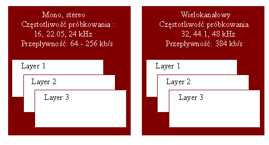 Norma opisująca standard MPEG zawiera trzy warstwy kodowania różniące się złożonością i stopniem kompresji.