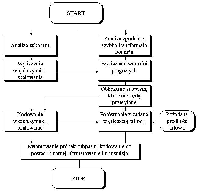 macji. Jednym ze sposobów ograniczenia przepływności jest wprowadzenie kwantowania dynamicznego, w którym odległości między poziomami kwantowania są różne dla różnych amplitud sygnału. Stosuje się też kwantowanie nierównomierne, różniczkową modulację kodowo-implsową, modulację delta.Następnie wejściowe sygnały foniczne są przekształcane z dziedziny czasu w dziedzinę częstotliwości przy wykorzystaniu zestawu filtrów dzielącego widmo sygnału na 32 podpasma.