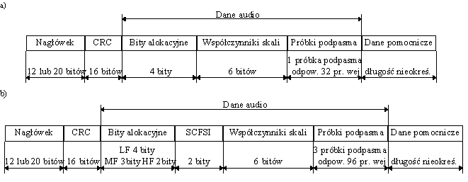 Rys. 8. Strumień bitów dla MPEG a) format ramki dla warstwy I, b) format ramki dla warstwy II.