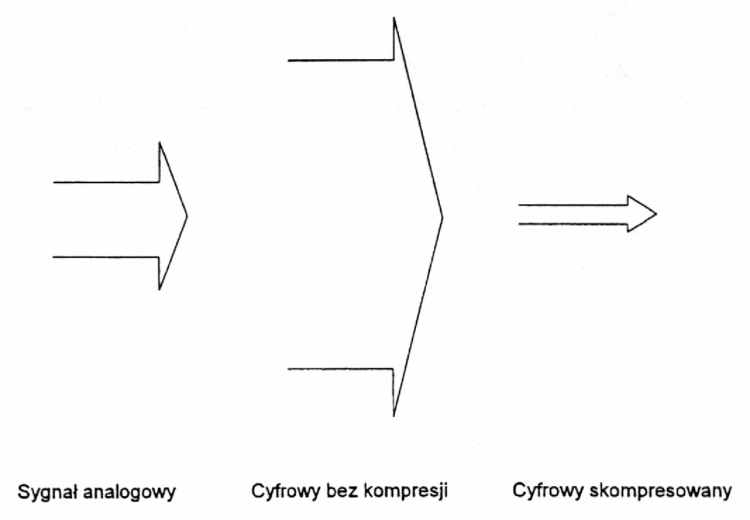 hnik cyfrowych pociąga za sobą coraz szersze wykorzystywanie cyfrowych sygnałów wizyjnych i fonicznych. Cyfryzacja sygnałów pozwala na uzyskiwanie szeregu zalet, zarówno jakościowych jak i operacyjnych, wiąże się jednak ze wzrostem szerokości pasma sygnałów, gdyż sygnał cyfrowy zajmuje znacznie większą szerokość pasma niż sygnał analogowy reprezentujący ten sam obraz. Stąd od chwili powstania koncepcji cyfryzacji sygnałów wizyjnych rozpoczęto prace nad kompresją tych sygnałów. Kompresja cyfrowych sygnałów wizyjnych jest możliwa i może być bardzo skuteczna, a sygnał cyfrowy skomprymowany może zajmować węższe pasmo niż sygnał analogowy co obrazuje poniższy rysunek. Dopuszczalny stopień' kompresji zależy od wymagań' co do jakości sygnału i od skuteczności zastosowanej metody kompresji.