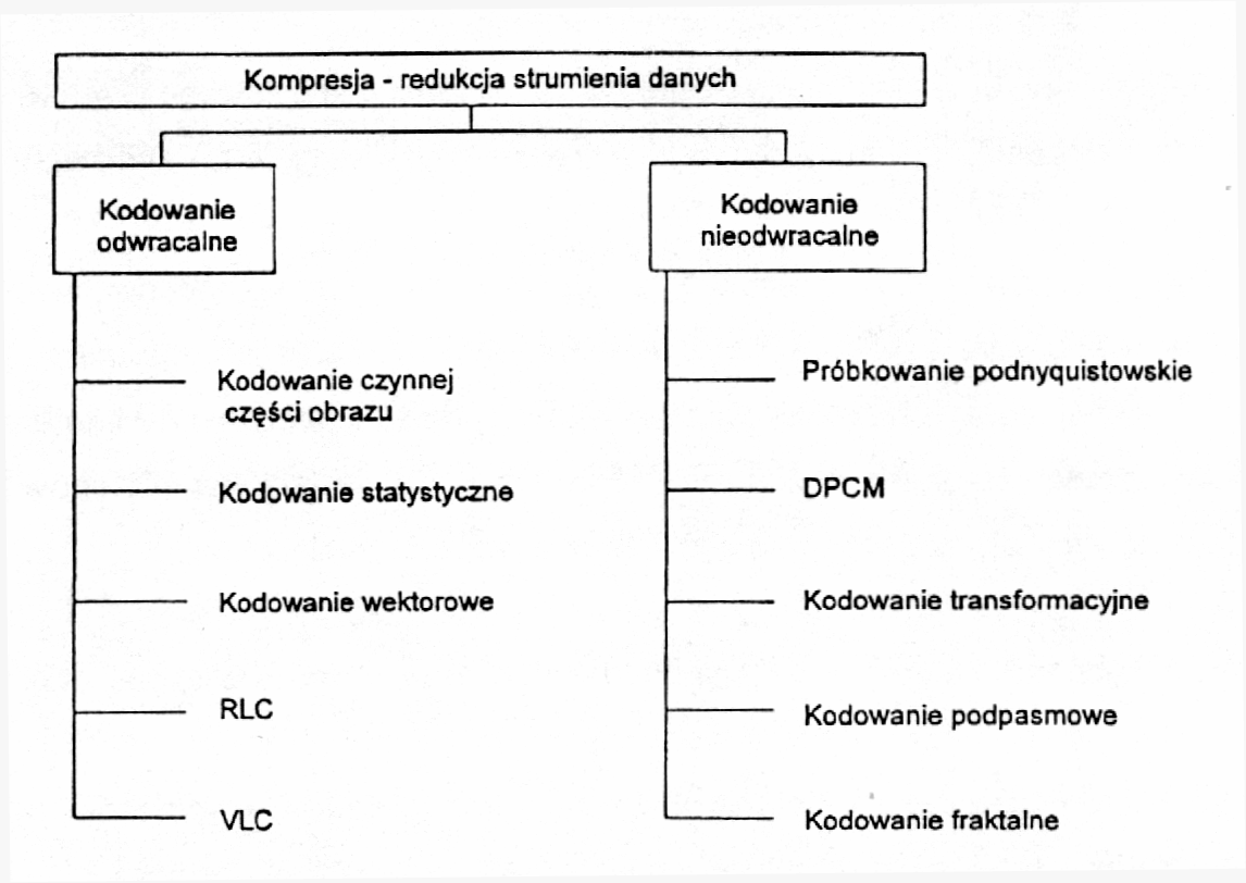 gnałów na CD-ROMach.Techniki kompresji sygnału wizyjnego można podzielić na odwracalne i nieodwracalne. Przy kodowaniu statycznym, jak również kodowaniu entropijnym żadne informacje nie są tracone w procesie kodowania i dekodowania (kompresja bezstratna); techniki takie mogą znaleźć zastosowanie w kanałach o zmiennym strumieniu danych, przy umiarkowanym stopniu kompresji - zależnym od rodzaju obrazu.
